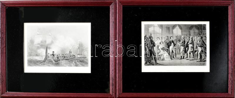 2 db I. Napóleont ábrázoló XIX. századi rézmetszet (császárrá koronázása, valamint angolok elleni tengeri ütközetben). Jelzettek a metszeten. Paszpartuban, üvegezett fakeretben, látható méret: 14,5x11,5 cm, keret: 26x23 cm