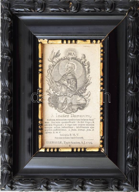 Leírás: Damaszkuszi Szent János (S. Ioanes Damascen), 1758. Rézmetszet, papír. Typis Academ. S. J. 11,5x7 cm. Üvegezett fakeretben.