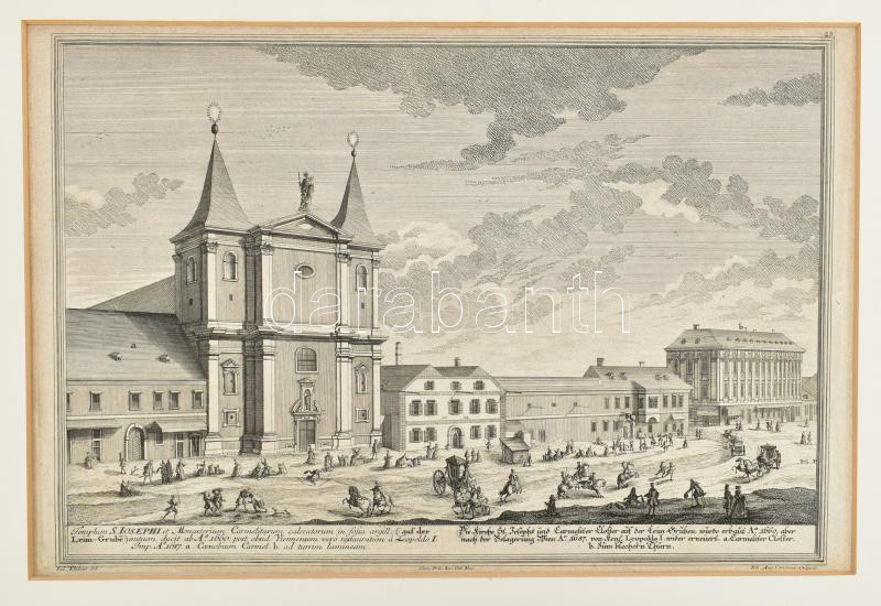 Salomonem Kleiner (1700-1761) rajza után, Johann-August Corvinus (1683-1738) metszése: Templum S. Iosephi et Monasterium Carmelitarum calceatorum in fossa argill. ... "WIEN VI, Laimgrubenkirche, Kirche St. Josef auf der Leim Gruben, Mariahilfer Straße 27". Rézmetszet, papír, jelzett a metszeten. Paszpartuban. 23,5x35,5 cm