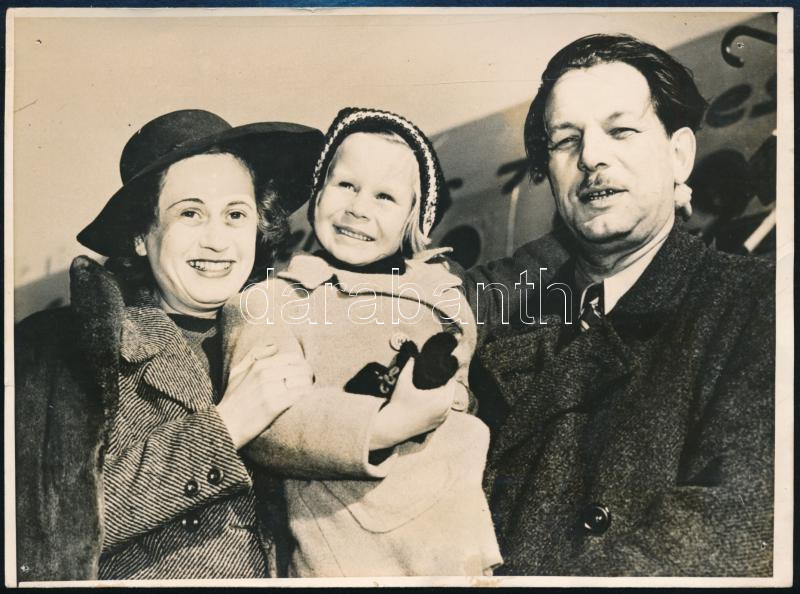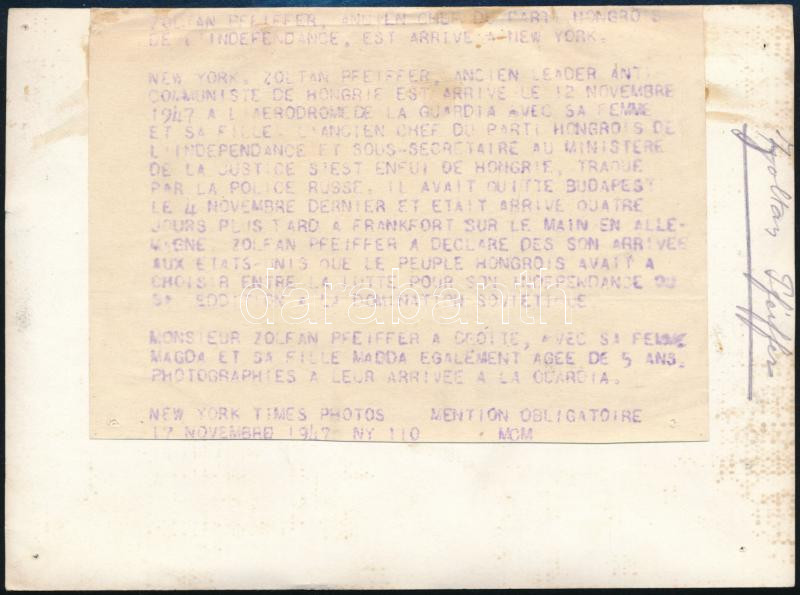1947 Pfeiffer Zoltán (1900-1981) ügyvéd, politikus, országgyűlési képviselő családjával megérkezik New Yorkba, miután elmenekült politikai okokból történő letartóztatása elöl. Feliratozott sajtófotó 18x14 cm