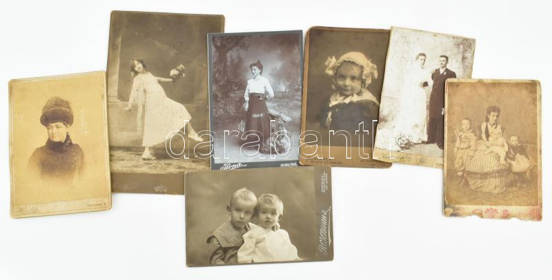 cca 1870-1910 Vegyes portrék különböző műtermekből (Ilona Szliácsfürdő, Rosenblatt Eperjes, Simonyi Pest, stb.), 7 db kabinetfotó, változó állapotban (közte sérült is), 16x10,5 cm és 21x13 cm között