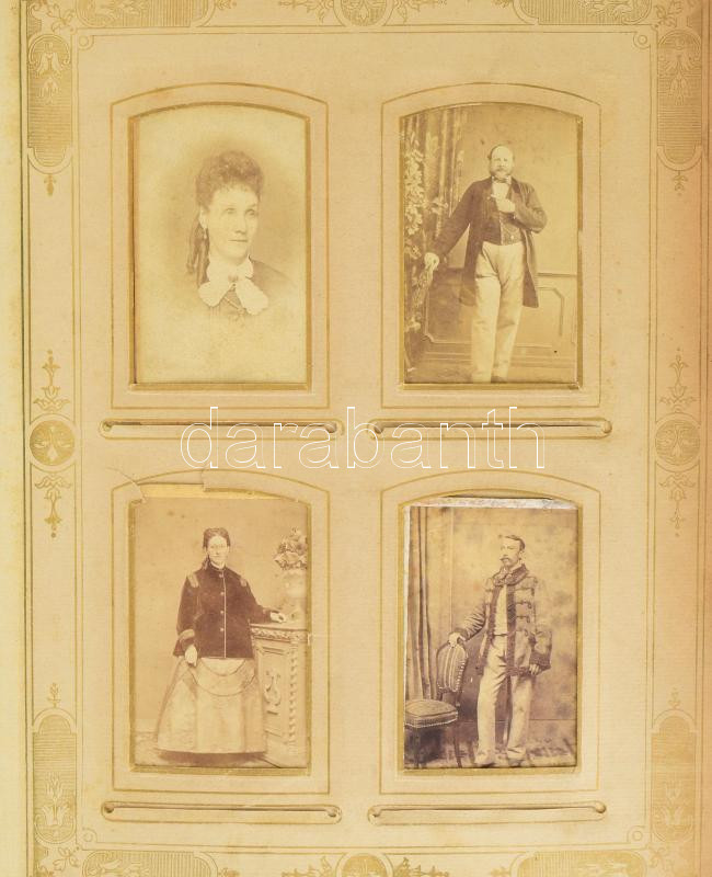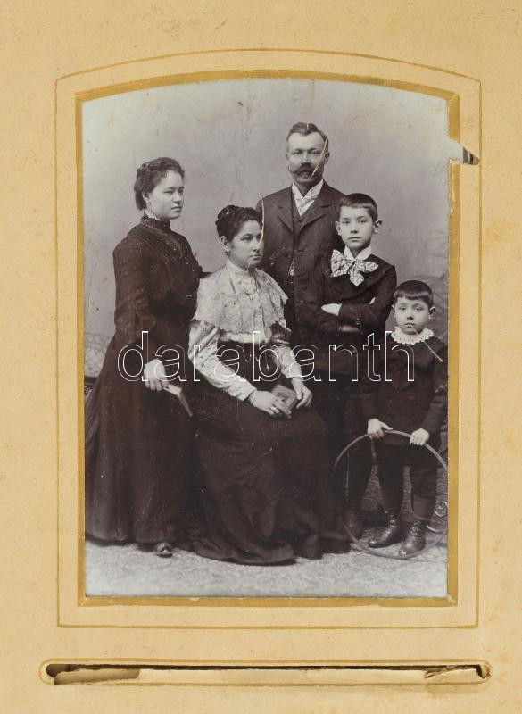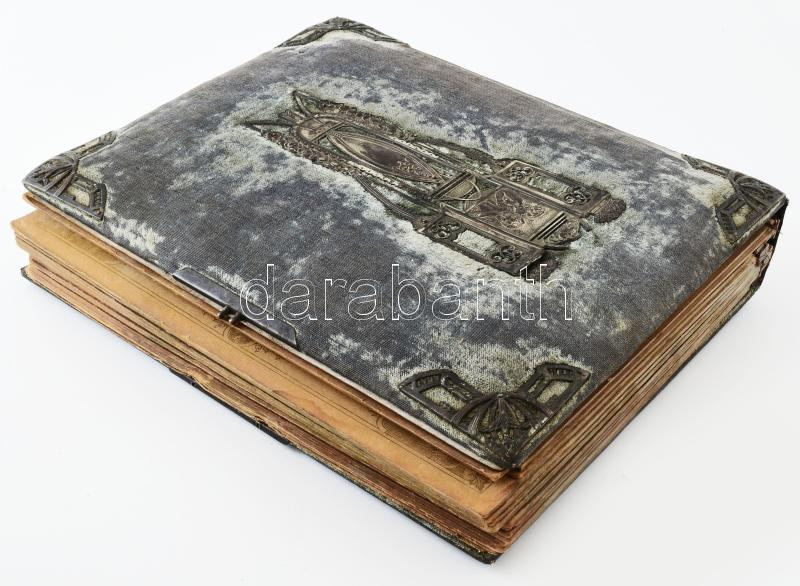 cca 1875-1915 Családi fotóalbum, összesen kb. 60 db keményhátú fotóval (vizitkártyák, kabinetfotók), főként budapesti, de külföldi műtermekből is. Köztük esküvői fotók, katonaportrék. Változó méretben és állapotban. Korabeli, szecessziós, fémveretekkel díszített, bársonyborítású albumban, kopott, borítóval, helyenként sérült lapokkal, 32x26x7 cm