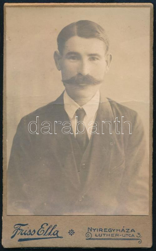 cca 1900-1910 Bajszos férfi portréja, vizitkártya Friss Ella nyíregyhá... https://www.darabanth.com/hu/454-Gyorsarveres/454.0/Fotomuveszet/Foto~500023/cca-1900-1910-Bajszos-ferfi-portreja-vizitkartya-Friss-Ella-nyiregyhazi-mutermebol-kisse-~II3026052