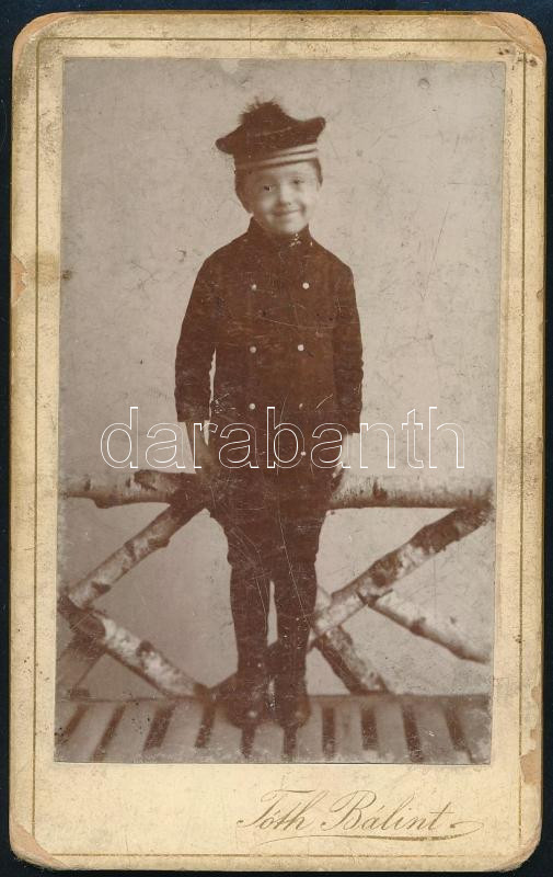 Leírás: cca 1900 Kisfiú portréja, vizitkártya Tóth Bálint mátészalkai fényképész műterméből, viseltes állapotban, 10,5x6,5 cm