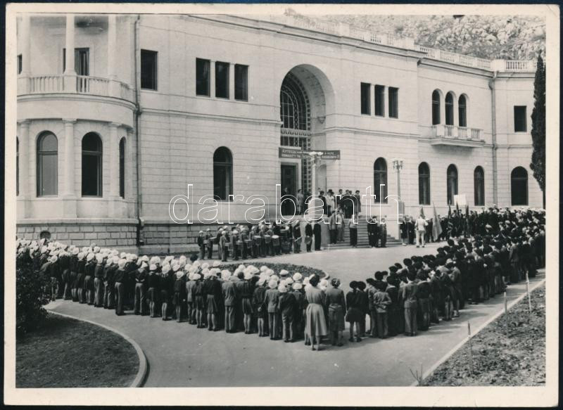 cca 1965 Hurzuf/Gurzuf (Krím-félsziget), Jurij Gagarin szovjet űrhajós ünneplésére összegyűlt tömeg a Szuuk-Szu Palota előtt, fotó, 18x13 cm / cca 1965 Hurzuf/Gurzuf (Crimea), crowd gathered for the celebration of Yuri Gagarin Soviet astronaut in front of Suuk-Su Palace, photo