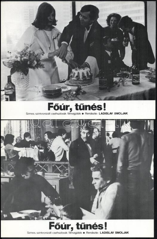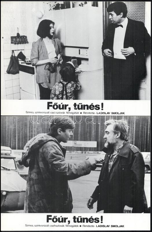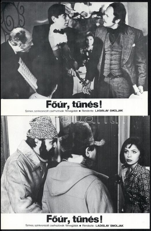 cca 1980 ,,Főúr, tűnés!" című csehszlovák filmvígjáték jelenetei és szereplői, 8 db produkciós filmfotó nyomdatechnikával sokszorosítva kartonpapírra, egyoldalas nyomással, a használatból eredő (esetleges) kisebb hibákkal, 18x24 cm