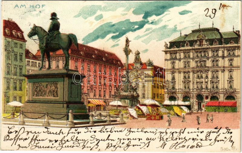 1902 Wien, Vienna, Bécs; Am Hof. Art Nouveau litho (fl) https://www.darabanth.com/hu/454-Gyorsarveres/454.0/Kepeslapok/Ausztria~1000020/1902-Wien-Vienna-Becs-Am-Hof-Art-Nouveau-litho-fl~II3024968