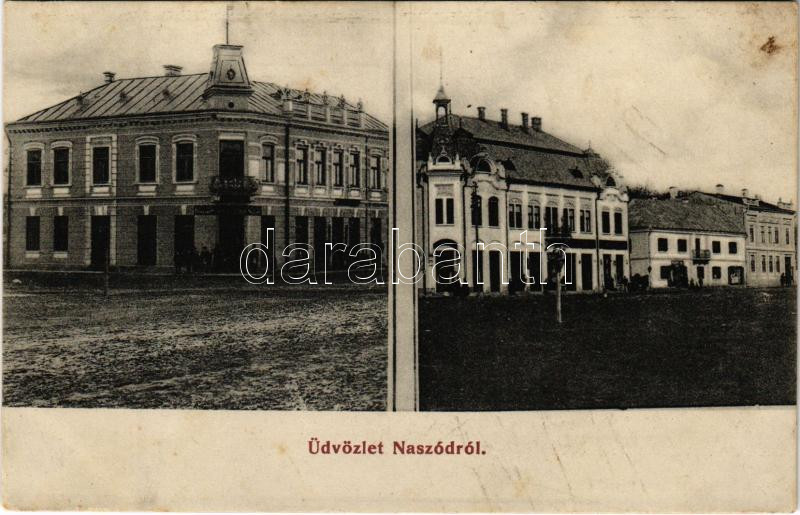 Leírás: 1916 Naszód, Nasaud; községháza, Aurora bank. Selmeczki Imre kiadása 162. / town hall, bank (EK)