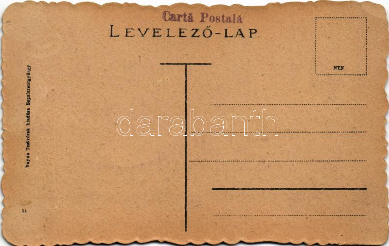 Leírás: Sepsiszentgyörgy, Sfantu Gheorghe; Piata Regina Maria / Fő tér felett egy repülőgép. Vayna testvérek kiadása / aircraft above the main square (EK)