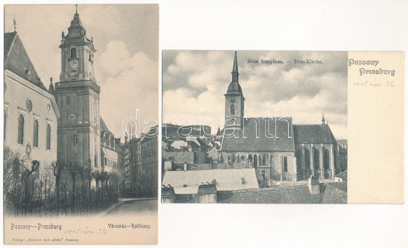 Pozsony, Pressburg, Bratislava; - 5 db régi hosszú címzéses képeslap szép állapotban: Szt. Márton szobor, Frigyes főhercegi palota, Mária Terézia szobor, Városház, Dóm templom / 5 pre-1900 postcards in nice condition: statues, town hall, church, palace