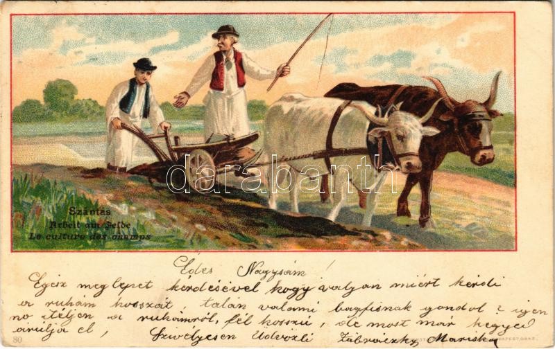 Leírás: 1899 Szántás, magyar folklór / Arbeit am Felde / Hungarian folklore, ploughing. Kunstanstalt Kosmos 80. litho (EK)