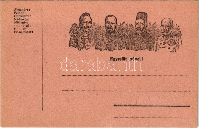 Egyesült erővel! Első világháborús tábori postai levelezőlap a Központi Hatalmak uralkodóival: V. Mehmed, I. Ferdinánd, II. Vilmos, I. Ferenc József / WWI Austro-Hungarian K.u.K. military field postcard, Viribus Unitis and Central Powers propaganda: Mehmed V, Ferdinand I of Bulgaria, Wilhelm II, Franz Joseph I of Austria. Feldpostkarte (EK)