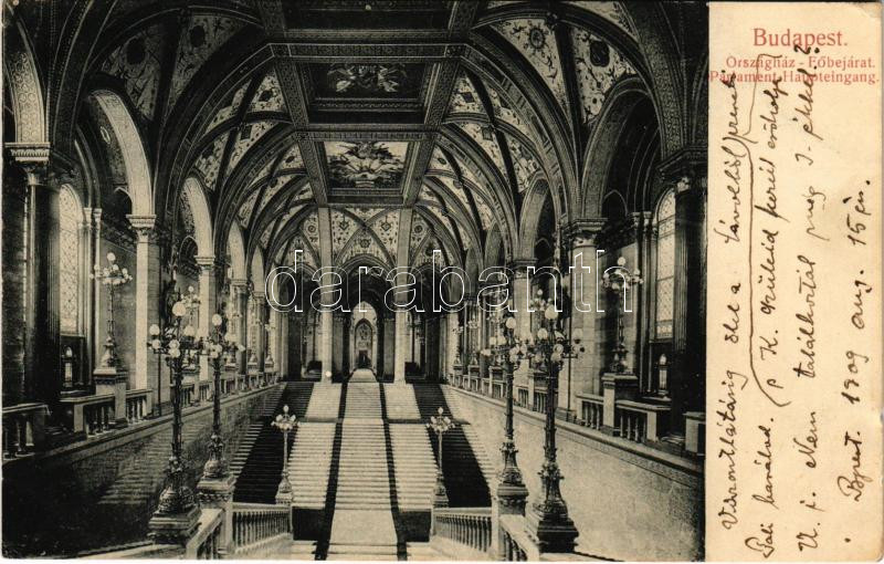 1909 Budapest V. Országház, Parlament, főbejárat, belső. Taussig A. 98... https://www.darabanth.com/hu/454-Gyorsarveres/454.0/Kepeslapok/Magyarorszag~1000005/1909-Budapest-V-Orszaghaz-Parlament-fobejarat-belso-Taussig-A-9833-EK~II3028858