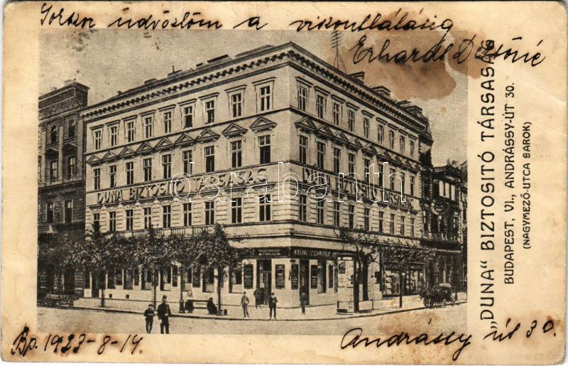 1923 Budapest VI. Duna Biztosító Társaság. Andrássy út 30. (Nagymező u... https://www.darabanth.com/hu/454-Gyorsarveres/454.0/Kepeslapok/Magyarorszag~1000005/1923-Budapest-VI-Duna-Biztosito-Tarsasag-Andrassy-ut-30-Nagymezo-utca-sarok-Rb~II3028176