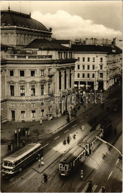 Leírás: 1961 Budapest VIII. Nemzeti Színház, villamosok, autóbusz. Képzőművészeti Alap