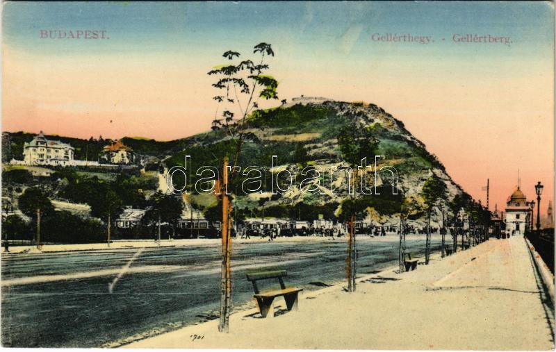 Budapest XI. Gellért tér a Gellért szálloda megépítése előtt, villamosok, háttérben a Svéd ház (1945-ben a Svéd Nagykövetség épülete, itt dolgozott Raoul Wallenberg aki svéd útlevelekkel segítette a zsidókat)
