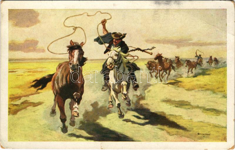 Leírás: Hortobágy, Pányvavető. Magyar folklór művészlap. Fővárosi Nyomda Rt. s: Benyovszky István (EB)