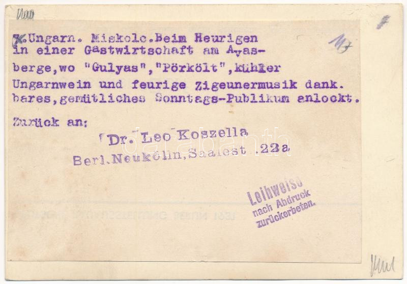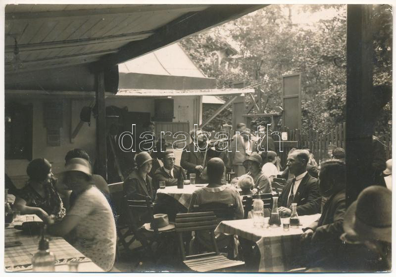 Miskolc, Beim Heurigen in einer Gastwirtschaft am Avas / Avasi vendéglő kerthelyisége, Kovács Károly reklám, zenészek az étterem udvarán. photo (non PC) (13,9 x 9,6 cm)