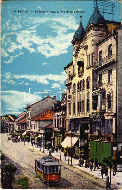 Leírás: Miskolc, Széchenyi utca, villamos, Apolló színház, mozi, Pannonia kávéház, Weidlich Pál üzlete (ázott / wet damage)
