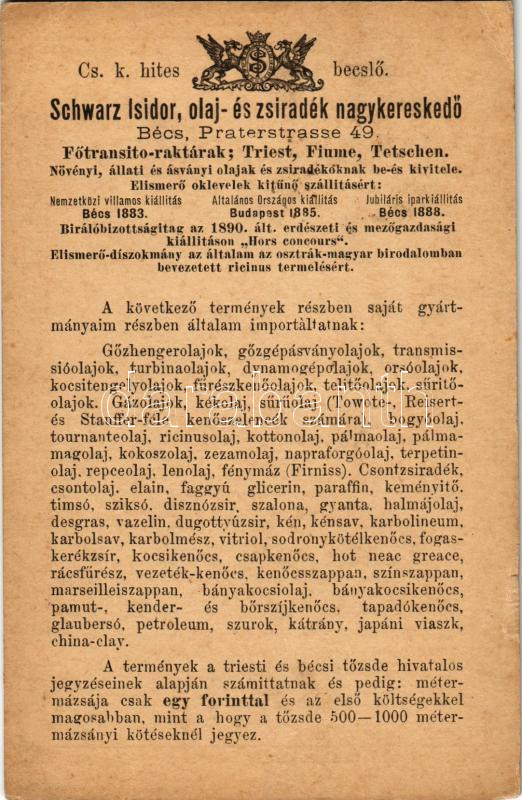 Leírás: 1891 (Vorläufer) Schwarz Isidor olaj- és zsiradék nagykereskedő reklámlapja. Bécs, Praterstrasse 49. / Viennese (Wiener) oil and fat wholesaler's early advertising postcard (kis szakadások / small tears)