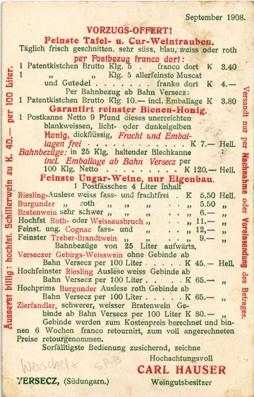 Leírás: 1908 Versec, Werschetz, Vrsac; Gruss aus den Weinbergen! Carl Hauser Weingutsbesitzer / Carl Hauser borászatának reklámlapja, hátoldalon árlista / winery advertisement card. Seidner Chromolith. Kunstanst. Budapest litho (non PC) (r)