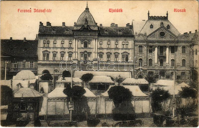 1910 Újvidék, Novi Sad; Ferenc József tér, Kioszk, Mayer Nagy szálloda, sörcsarnok, Récsei Gusztáv üzlete, piac. Vajda D. fényképész / square, grand hotel, beer hall, market, shop (fl)