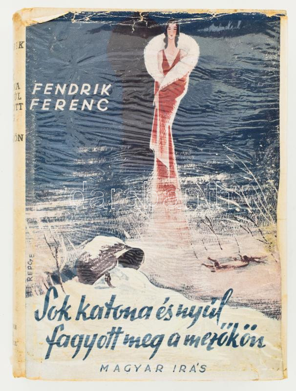 Fenderik Ferenc: Sok katona és nyúl fagyott meg a mezőkön. Bp., 1945., Magyar Írás. A borító Repcze János (1905-1985) grafikus munkája. Kiadói kissé foltos kartonált papírkötés, kiadói kissé szakadozott, kissé foltos papír védőborítóban, műanyag védőfóliával.