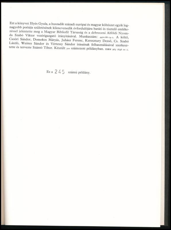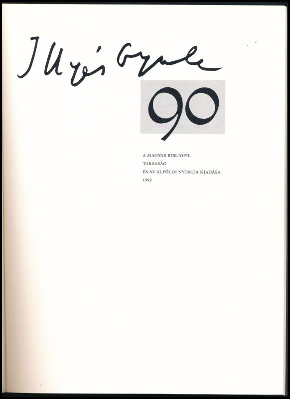 Illyés Gyula 90. A költő születésének 90. évfordulójára. Szerkesztette és tervezte: Szántó Tibor. Illyés Gyula, Csoóri Sándor, Domokos Mátyás, Juhász Ferenc, Keresztury Dezső, Cs. Szabó László, Weöres Sándor, és Vértessy Sándor írásaival. Bp.-Debrecen, 1992., Magyar Bibliofil Társaság-Alföldi Nyomda. Kiadói papírkötés. Számozott (245./500) példány.