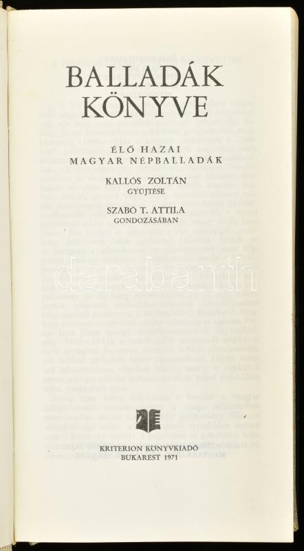 Kallós Zoltán: Balladák könyve. Élő hazai magyar népballadák. - - gyűjtése. Szabó T. Attila gondozásában. Bukarest, 1971, Kriterion, 678 p. Első kiadás. Kiadói egészvászon kötés, hímzett borítóval, jó állapotban.