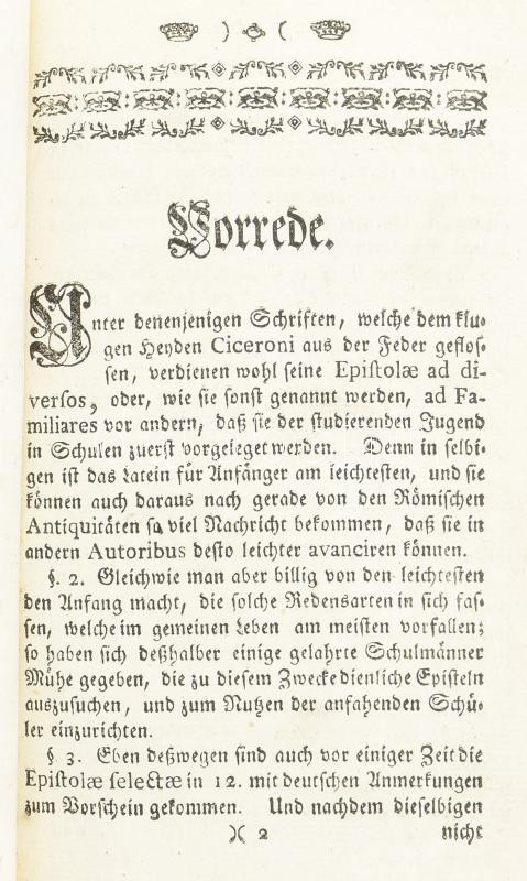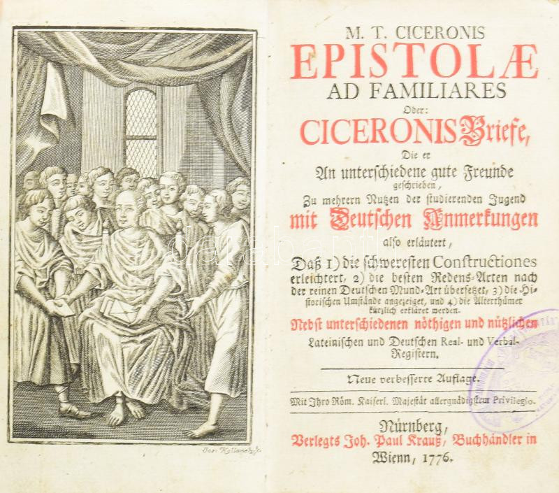 M. T. Ciceronis Epistolae ad familiares. Oder: Ciceronis Briefe die er an unterschiedene gute Freunde geschrieben, zu mehren Nutzen der studierenden Jugend mit Teutschen Anmerkungen also erläutert etc. Nürnberg - Wien, 1776, Joh. Paul Krauß. 740 p. Korabeli bordázott egészbőr kötésben