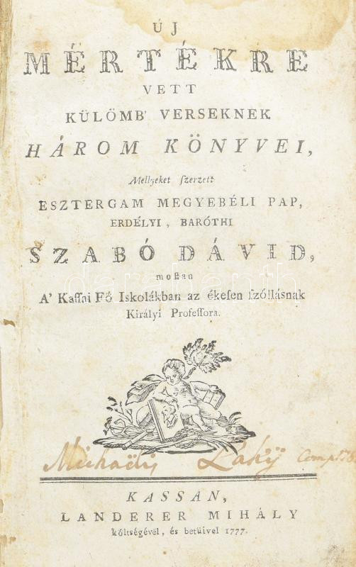 Verskoszorú, melyet az új mértékre vett, s üdővel megegyengetett és későbben készült verseiből kötött erdélyi, baróti Szabó Dávid. Kassa, 1786, Füskúti Landerer Mihály. Félvászon kötés, kopottas állapotban sérült borítóval. Első néhány lapon foltok