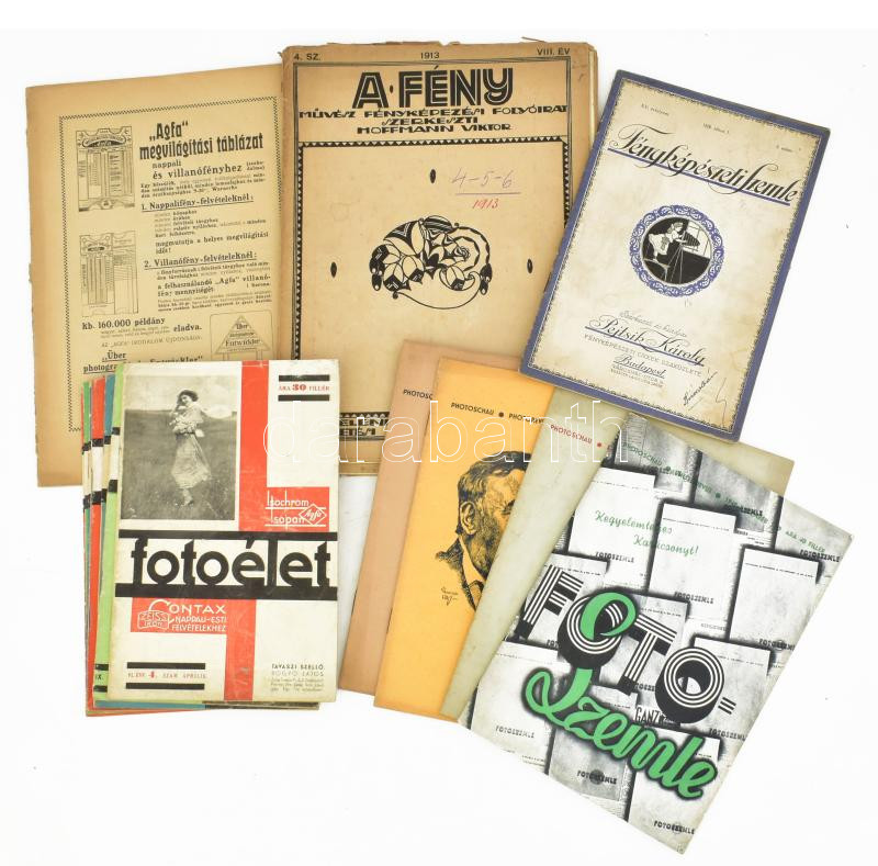 Leírás: 1913-1943 Vegyes fotós újság tétel, 14 db: 1926 Fényképészeti szemle XV. évf. 3 sz.,1940 4 db Fotoszemle szám, 1936-1942 Fotóélet 7 száma, 1913 A Fény 2? hiányos, megviselt száma. Változó állapotban.