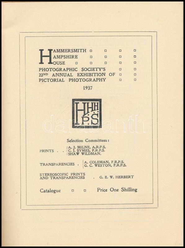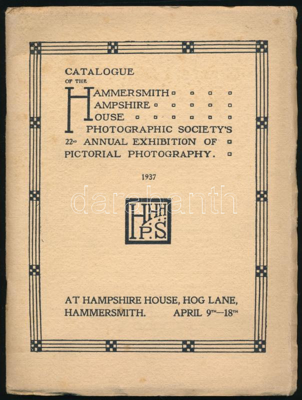1937 Catalogue of the Hammersmith Hampshire House Photographic Society's 22nd annual exhibiton of a picoral photography. Hammersmith, 1937, Hampshire House, 58+6 p. Fekete-fehér fotókkal. Angol nyelven. Benne magyar nevekkel is, valamint Csörgeő Tibor, Angyalfi Andor egészoldalas fotóival is. Kiadói papírkötésben.