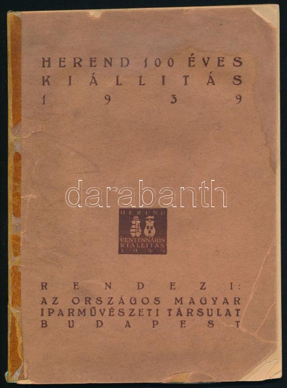 1939 Herend 100 éves kiállÃtás. Bp., 1939, Országos Magyar Iparművészeti Társulat (Hollóssy János-ny.), 45 p. Kiadói tűzött papÃrkötés, sérült, ragasztott, a tűzéstÅ‘l elvált borÃtóval, helyenként sérült lapokkal, különvált cÃmlappal. RendkÃvül izgalmas kiállÃtási katalógus a Herendi Porcelángyár történetébÅ‘l. Benne a kiállÃtók névsorával, az anyag gyűjtemény szerinti és a mai figurális tárgyak tervezÅ‘k szerinti, valamint a hamisÃtások felsorolásával. A világkiállÃtások jegyzékével, amin a gyár szerepelt. Korabeli reklámokkal. Ritka!