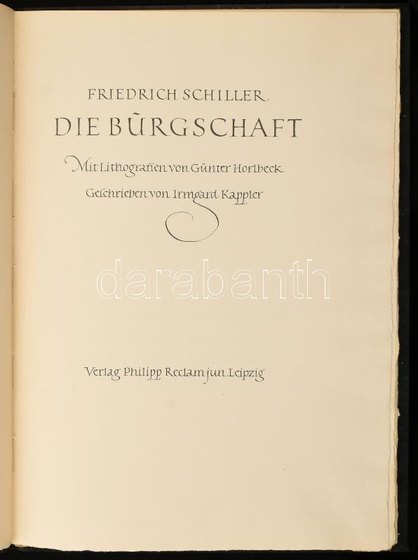 Friedrich Schiller: Die Bürgschaft. Mit Lithografien von Günter Horlbeck. Geschrieben von Irmgard Kappler. Leipzig, [1955], Philipp Reclam. Egészoldalas illusztrációkkal. Német nyelven. Kiadói egészvászon-kötés. Megjelent 1100 példányban. Számozott (740./1100), Günter Horlbeck és Irmgard Kappler által aláírt példány!