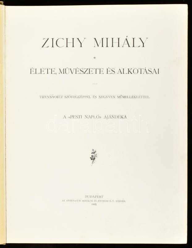 Zichy Mihály élete, művészete és alkotásai. Tizennyolc szövegképpel és negyven műmelléklettel. A Pesti Napló ajándéka. Bp., 1902, Athenaeum, 76p. + 40 t. Számos szövegközi és egészoldalas illusztrációval. Kiadói illusztrált, festett, szecessziós egészvászon-kötésben, a borítón kopásnyomokkal, foltokkal, utolsó tábla kissé laza.
