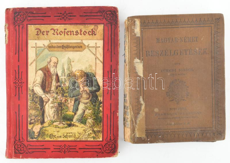 Schmid, Christoph von: Der Rosenstock und andere Erzählungen. Hn. én. kn.Német nyelvű gyermekkönyv. Félvászon-kötés, enyhén sérült, kopott./ Füredi Ignácz: Magyar-Német beszélgetések. Budapest, 1892, Méhner Vilmos kiadása. Magyar-Német kétnyelvű könyv. Egészvászon-kötés, gerince hiányzik, kopottas borító.