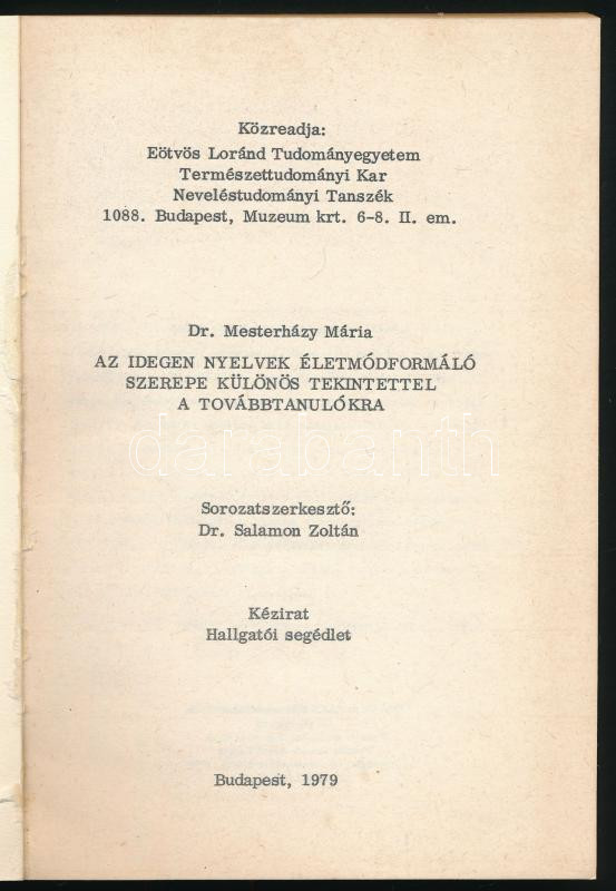 Dr. Mesterházy Mária: Az idegen nyelvek életmódformáló szerepe, különös tekintettel a továbbtanulókra. Pedagógiai Stúdium 16. (Hallgatói segédlet - Kézirat). Bp., 1979, ELTE TTK Neveléstudományi Tanszék, 204 p. Kiadói papÃrkötés, kissé foltos borÃtóval, a gerincen kis sérüléssel, a belsÅ‘ kötéstáblán ex libris-szel. Megjelent 400 példányban.