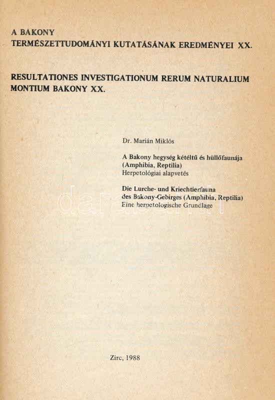Dr. Marián Miklós: A Bakony hegység kétéltű és hüllőfaunája. A Bakony természettudományi kutatásának eredményei XX. Zirc, 1988, Bakonyi Természettudományi Múzeum. Fekete-fehér képekkel illusztrálva. Kiadói papírkötés.