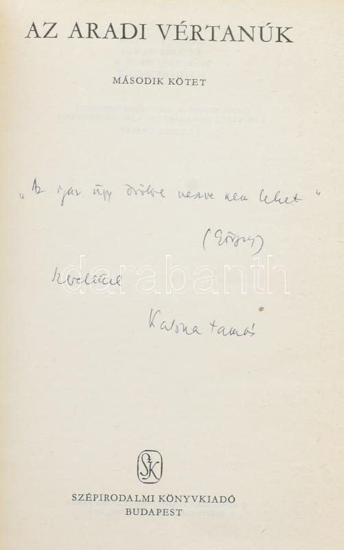 Az aradi vértanúk I-II. köt. Összegyűjtötte, a szöveget gondozta, a bevezető tanulmányt, és a jegyzeteket írta: Katona Tamás. A szerkesztő, Katona Tamás (1932-2013) történész, politikus által DEDIKÁLT példány. Magyar Századok. Bp., 1979, Szépirodalmi. Kiadói egészvászon-kötés, kiadói papír védőborítóban.