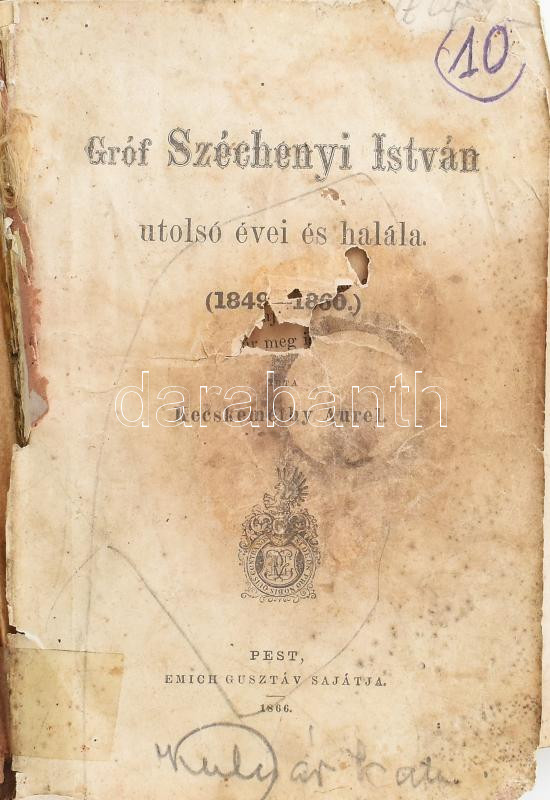 Kecskeméthy Aurél: Gróf Széchényi István utolsó évei és halála. (1849-1860.) Pest, 1866, Emich Gusztáv,1-64+67-94+97-160+163-164+173-188+191-192+2 p. Első kiadás. Átkötött kemény-kötésben, kopott, foltos, sérült borítóval, javított gerinccel, foltos, firkált, sérült lapokkal, hiányos, rossz állapotban.