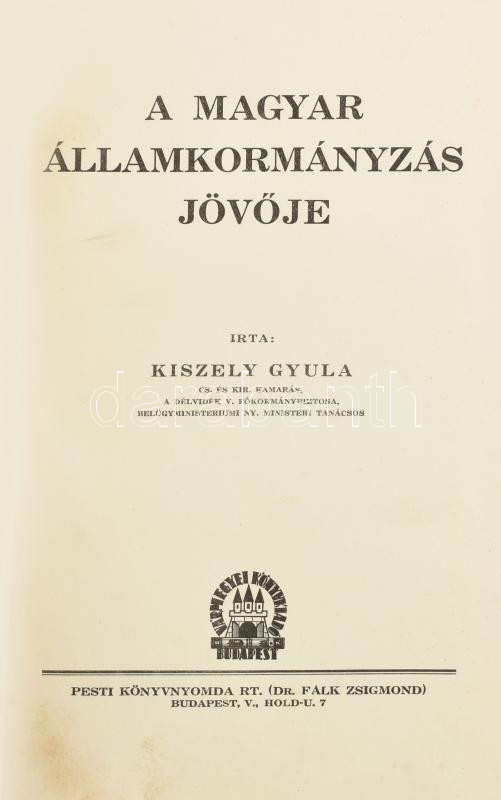 Leírás: Kiszely Gyula: A magyar államkormányzás jövője. 1. kötet. Bp., [1928], Vármegyei Könyvkiadó, (Pesti Könyvny.) VIII, 245 p., 3 sztl. lev.; Kiadói egészvászon kötésben, kis kopással