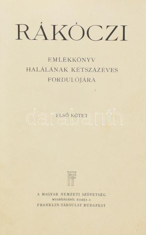 Leírás: Rákóczi emlékkönyv halálának kétszázéves fordulójára. I-II. kötet. Szerk.: Lukinich Imre. Gróf Mikes János előszavával. Bp., [1935], Franklin-Társulat. Szövegközi és egészoldalas képekkel illusztrálva, színes reprodukciókkal, facsimile mellékletekkel. Kiadói egészvászon-kötés, sérült borítóval, pótolt gerinccel, helyenként kissé foltos lapokkal, az elülső szennylapon tulajdonosi névbejegyzéssel.