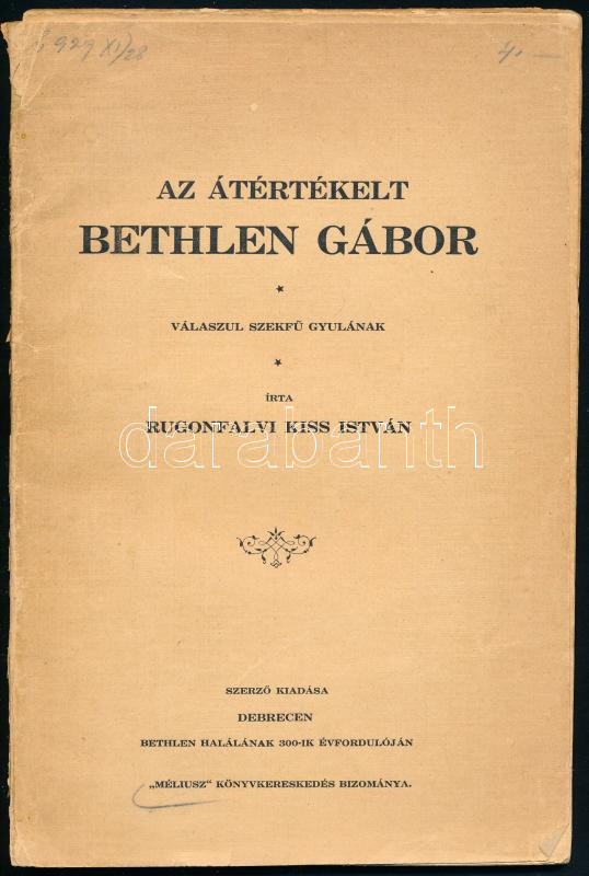 Rugonfalvi Kiss István: Az átértékelt Bethlen Gábor. Válaszul Szekfű Gyulának. Bethlen halálának 300-ik évfordulóján. Debrecen, (1929), Szerzői kiadása, 123 p. Kiadói papírkötés, szakadt borítóval, a könyvtest elvált a borítótól.