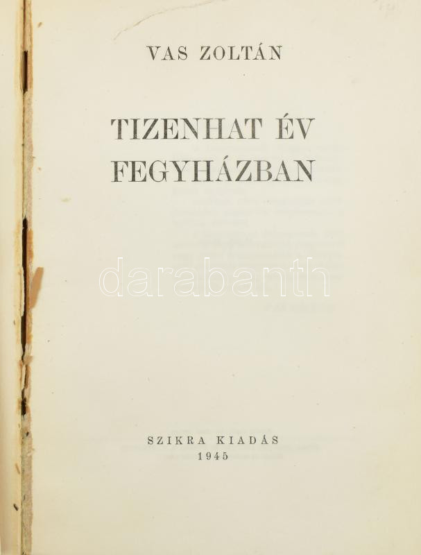Vas Zoltán: 16 év fegyházban. Bp., 1945, Szikra. Kiadói papírkötés, a papír védőborító sérült, hiányos, a címlap és az első lap szakadt, ex libris-szel.