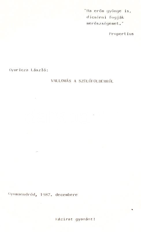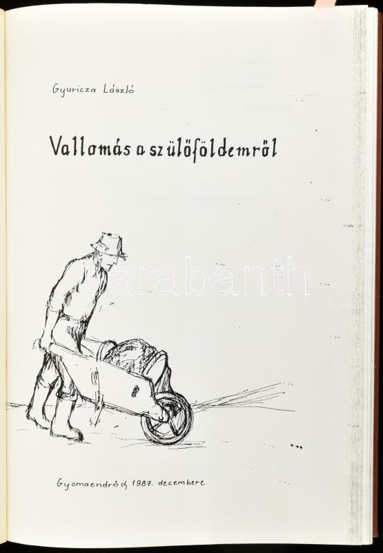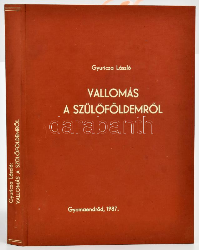 Gyuricza László: Vallomás a szülőföldemről. Kézirat gyanánt! Gyomaendrőd, 1987, Szerzői. A szerző aláírásával egy beragasztott lapon. Kiadói egészvászon-kötés.