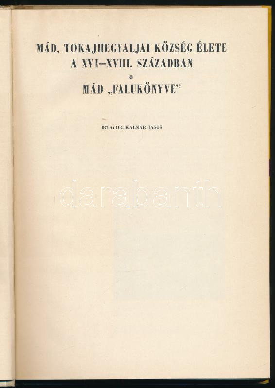 Kalmár János: Mád, Tokajhegyaljai község élete a XVI-XVIII. században. "Mád "falukönyve." Mád, 1968, Mád Községi Tanács V.B. Fekete-fehér szövegközti fotókkal illusztrált. Kiadói félvászon-kötés, kiadói papír védőborítóban. Megjelent 3000 példányban.