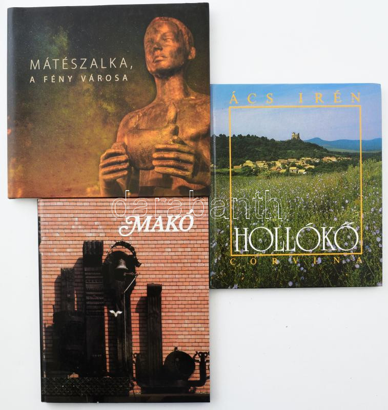 Vegyes könyvtétel, 3 db: Ács Irén: Hollókő. Bp.,1990.,Corvina. Gazdag képanyaggal illusztrált. Kiadói kartonált papírkötés.; Máteszalka, a fény városa. Képes album. Szerk.: Cservenyák László. Mátészalka, 2022., Mátészalka Város Önkormányzata. Gazdag képanyaggal illusztrált. Kiadói kartonált papírkötés, kiadói papír védőborítóban.; Szabóky Zsolt: Makó. Bp.,1985.,Corvina. Gazdag képanyaggal illusztrált. Kiadói kartonált papírkötés. + Makó hétszáz éve. Makó,1981, József Attila Múzeum. Kiadói papírkötés. Megjelent 2000 példányban.;