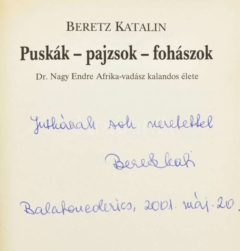 Beretz Katalin: Puskák - pajzsok - fohászok. Dr. Nagy Endre Afrika-vadász kalandos élete. A szerző, Nagy Endréné Beretz Katalin (1939-2018) által DEDIKÁLT! Zeusz vadászkönyvek. Bp., 2001, Zeusz. Fekete-fehér képekkel, fényképekkel illusztrált. Kiadói kartonált papírkötés.