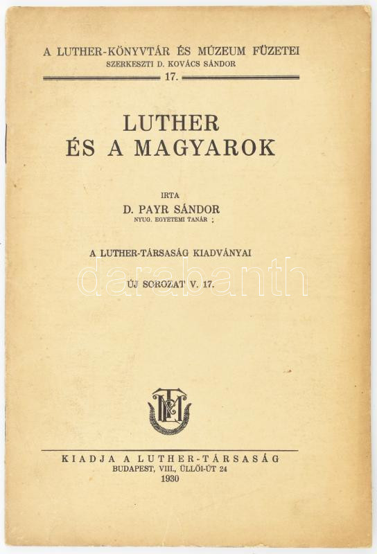 D. Payr Sándor: Luther és a magyarok. A Luther-Könyvtár és Múzeum füzetei 17. Bp., 1930, Luther-Társaság (Hornyánszky-ny.), 32 p. Kiadói tűzött papírkötés.